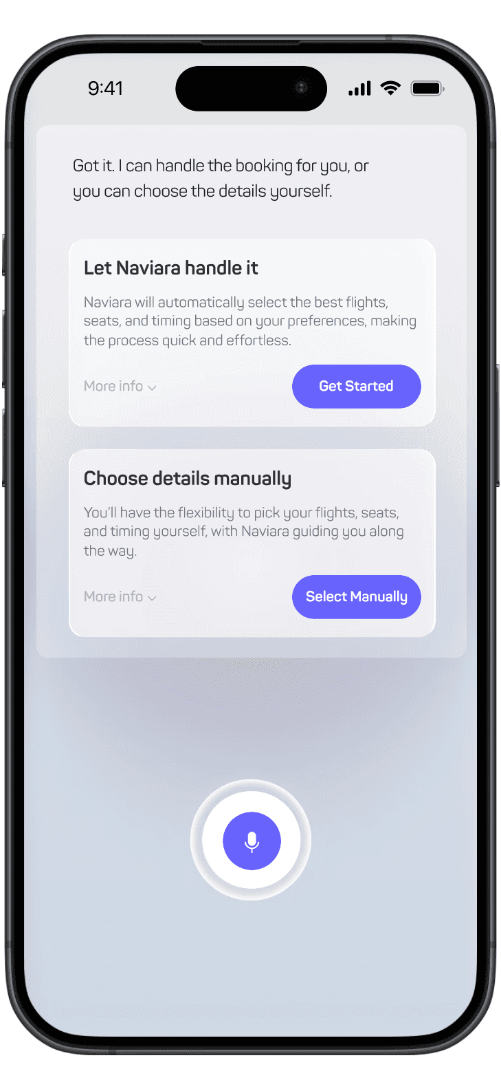 No more app hopping or repeated inputs. Naviara’s voice AI guides users through the entire travel booking process using natural voice commands alone.