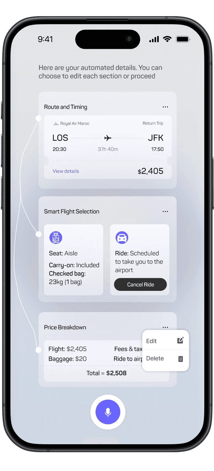 No more jumping between apps or forms. Naviara allows users to speak or type directly to an AI assistant that handles trip planning, booking, and payment in one continuous flow.